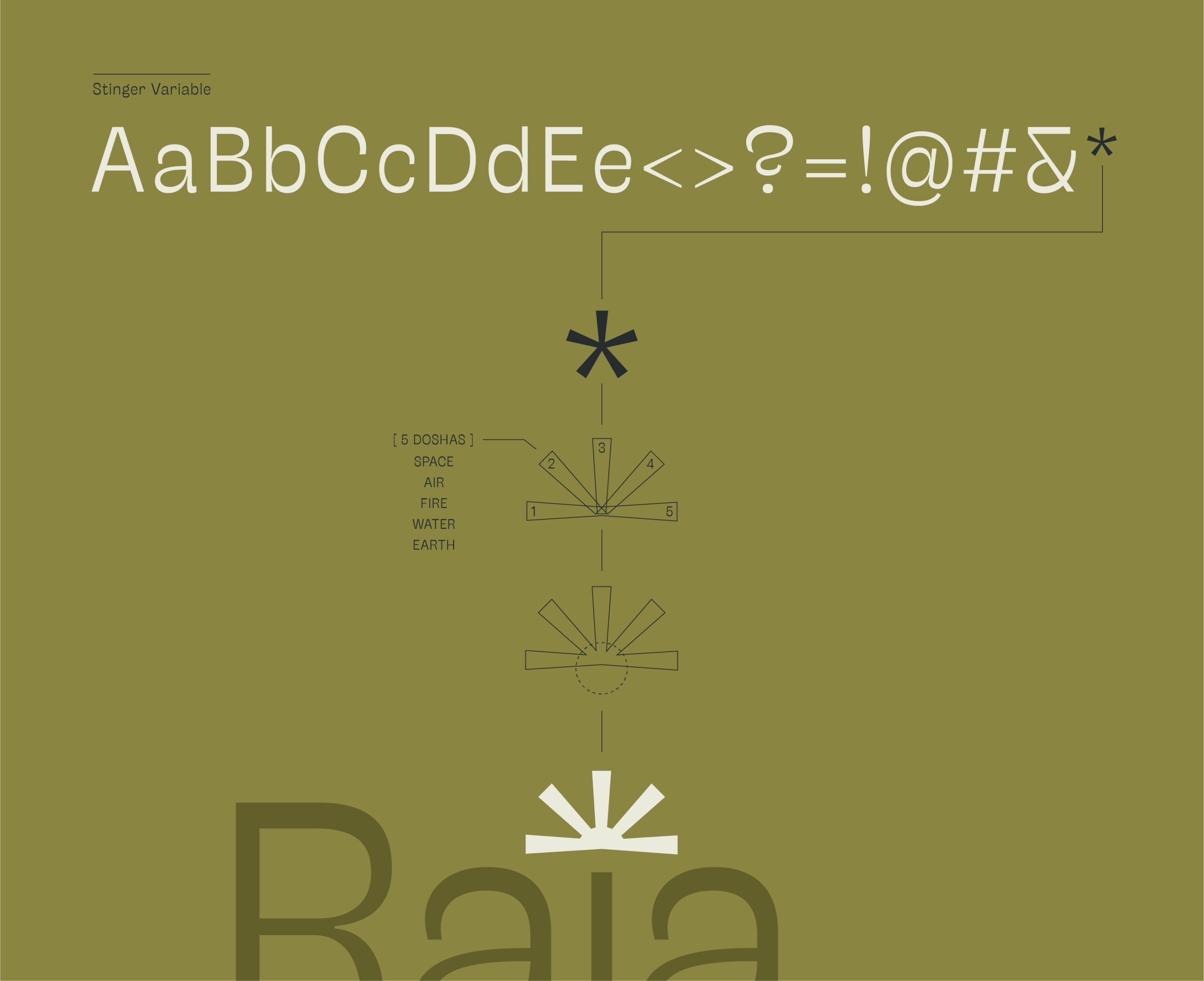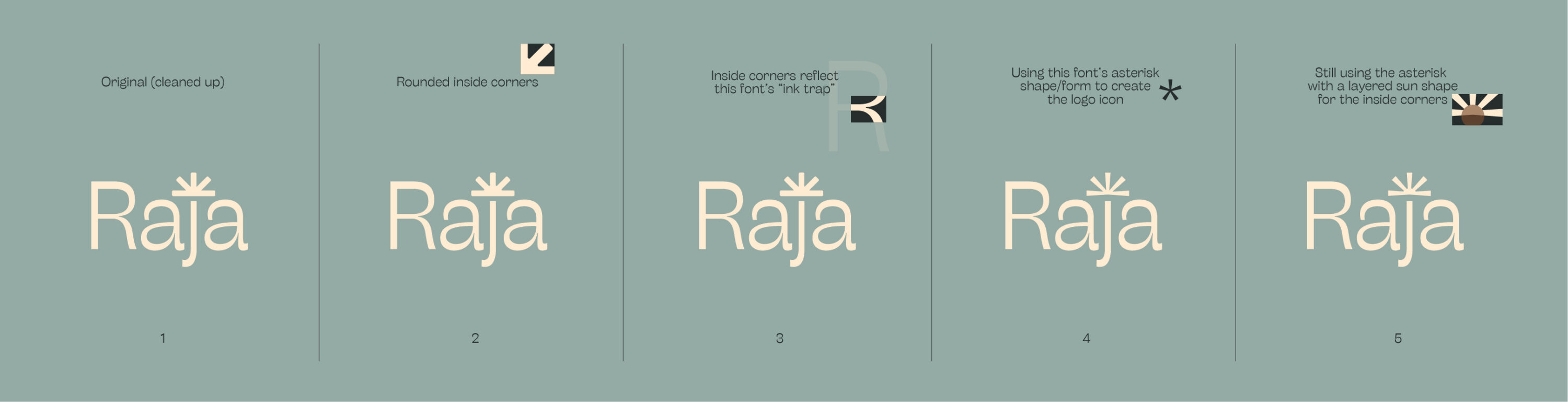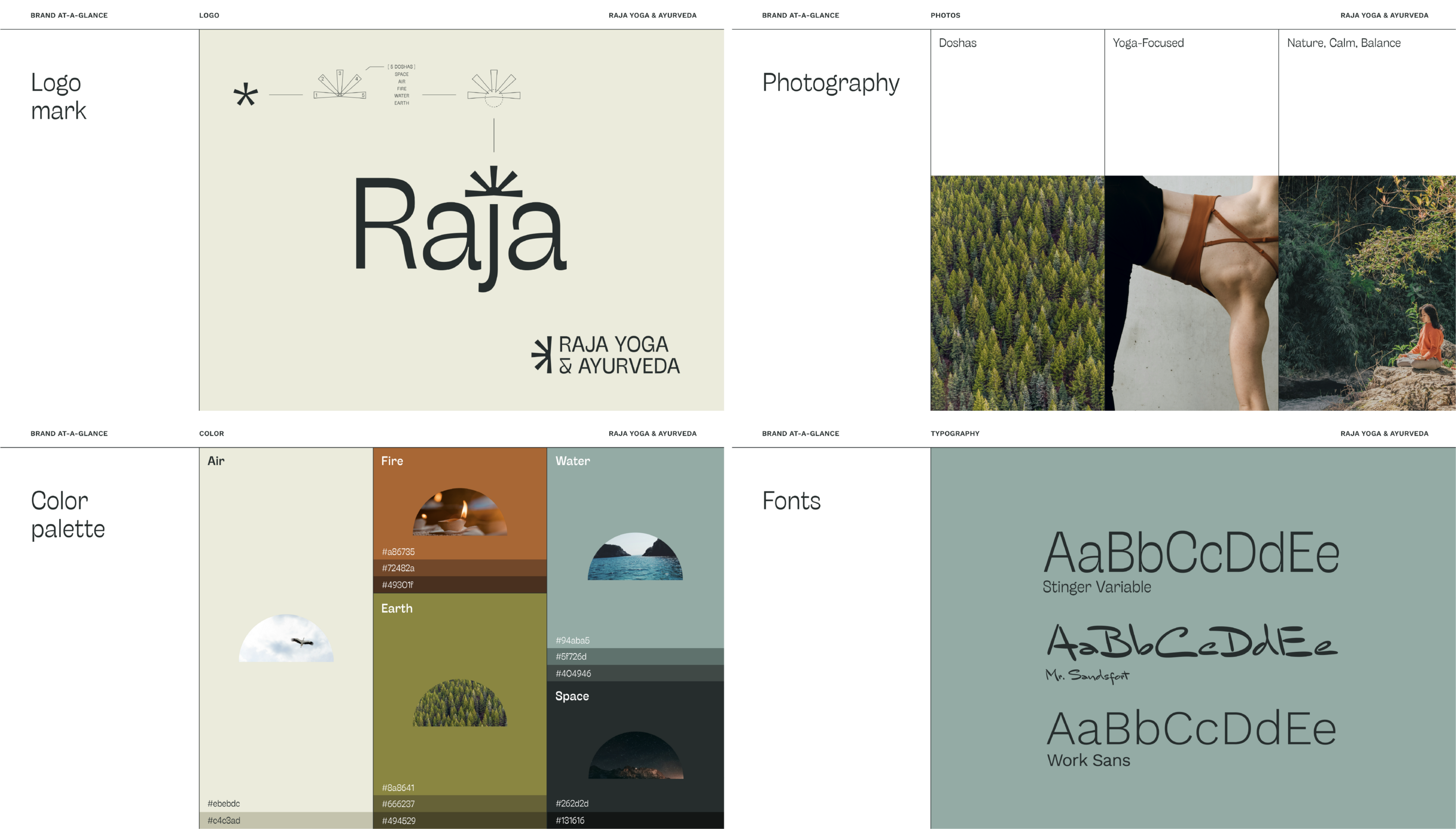 It was important that Raja’s logo avoids literal interpretations of yoga and Ayurvedic symbolism in favor of a more abstract, adaptable form. The final mark is intentionally flexible and quietly references Ayurveda’s five elements of space, air, fire, water, and earth through its structure and balance.