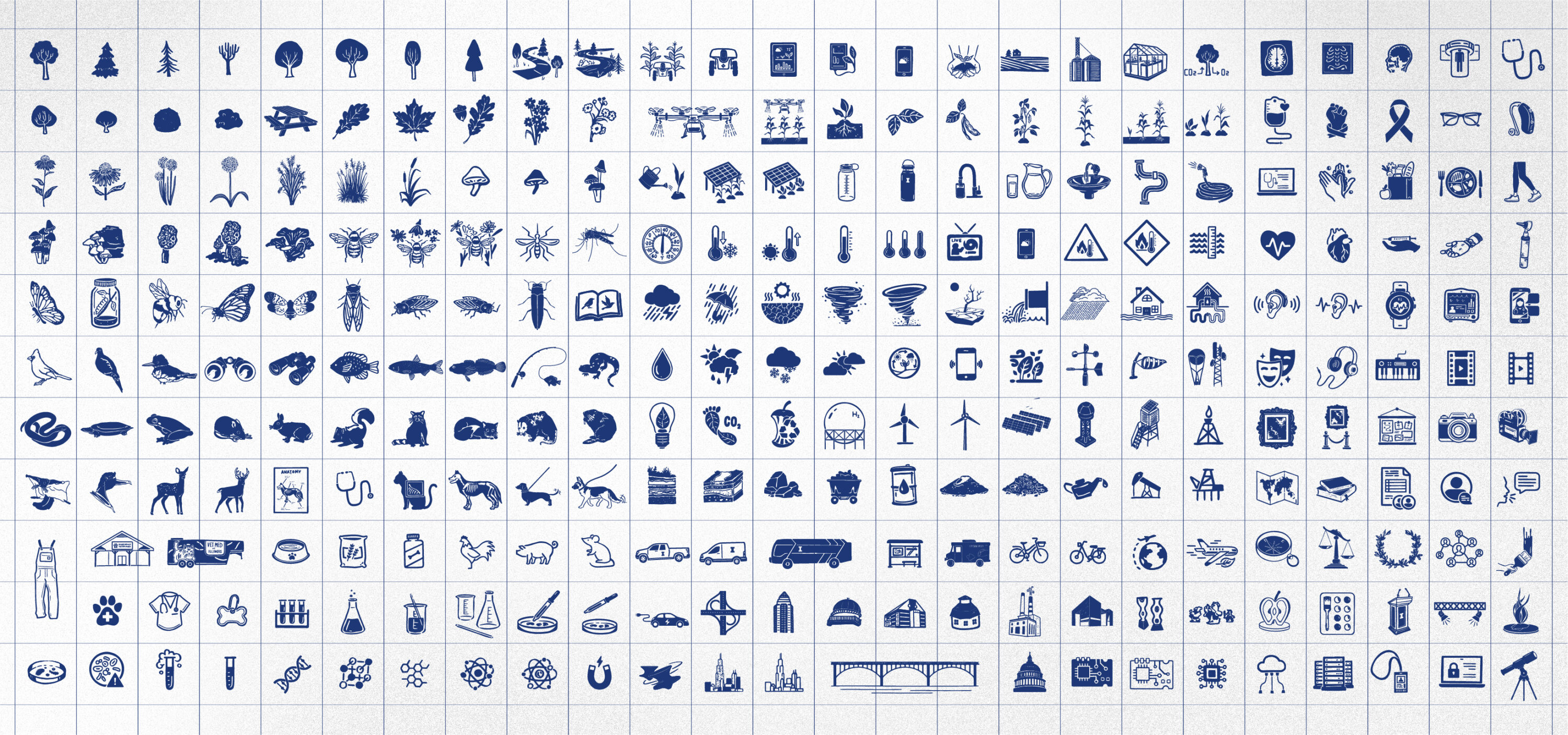 This large library of loosely drawn illustrations was the first asset library for the Office of the Vice Chancellor for Research & Innovation (OVCRI). When I first started as a designer in OVCRI I noticed a recurring challenge; visually supporting research in a way that represents the arts and humanities, science and technology, and everything in between.